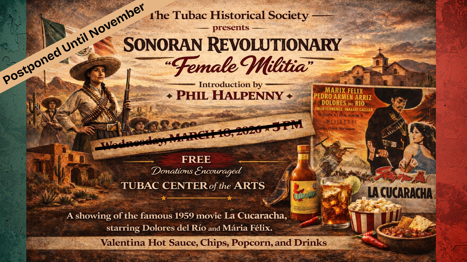 - POSTPONED UNTIL NOVEMBER – “Sonoran Revolutionary Female Militia” a presentation by Phil Halpenny followed by a showing of the movie “La Cucaracha” Valentina Ramírez Avitia.