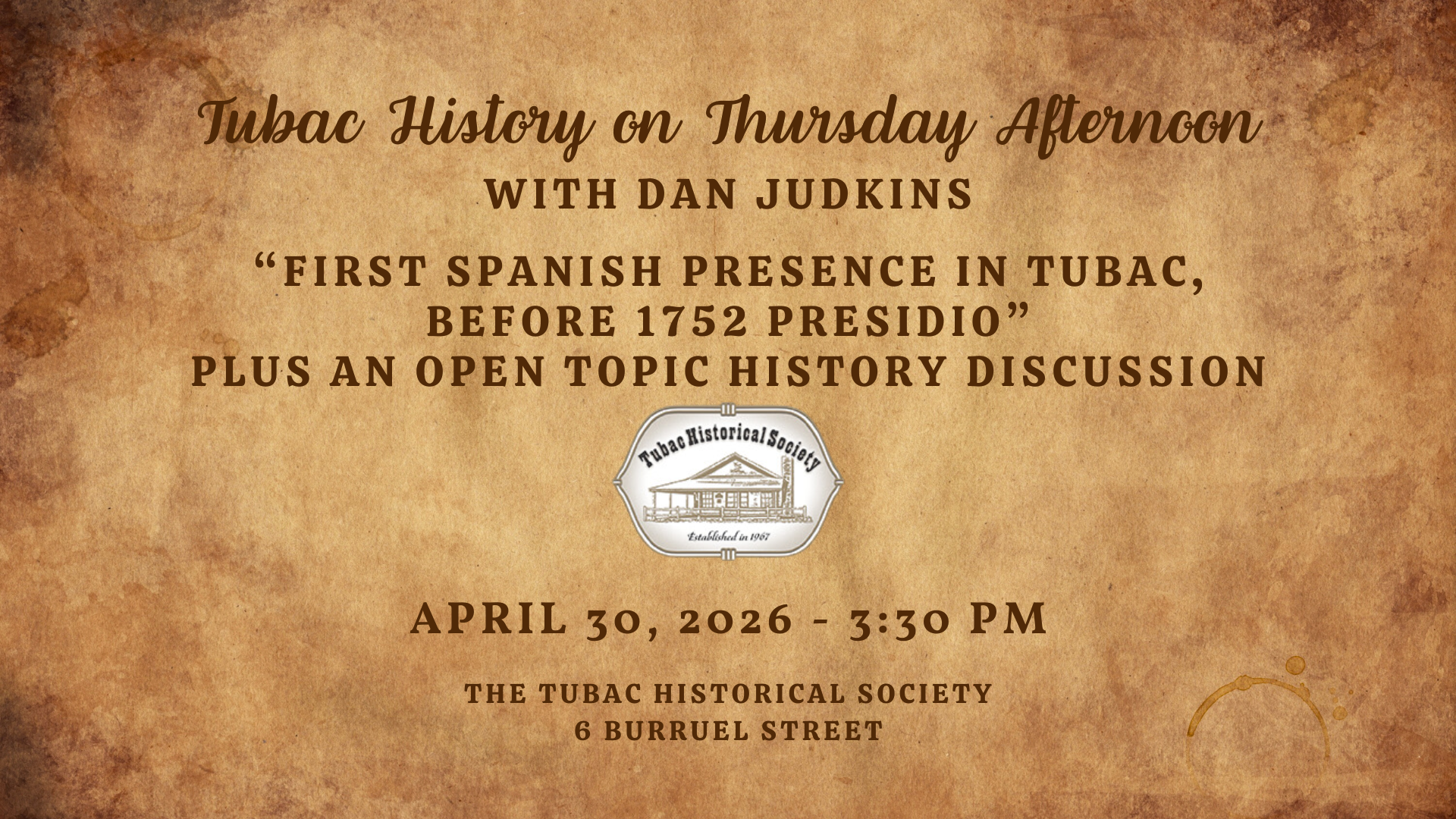 - Thursday, April 30th, 3:30 pm – Tubac History on Thursday Afternoon – Free! “First Spanish Presence in Tubac, Before 1752 Presidio. ” Click here to learn more!