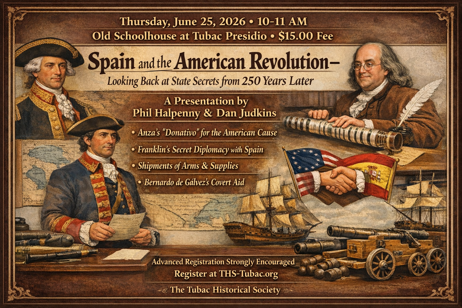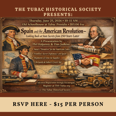Thursday, June 25th, 10:00 am to 11:00 am – at Tubac Presidio’s Old Schoolhouse – “Spain and the American Revolution – Looking Back at State Secrets from 250 Years Later,” a presentation by Phil Halpenny and Dan Judkins.